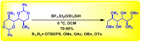 Regioselective Reductive Cleavage of bis-Benzylidene Acetal: Stereoselective Synthesis of Anti-cancer Agent OGT2378 and Glycosidase Inhibitor 1,4-Dideoxy-1,4-imino-L-xylitol